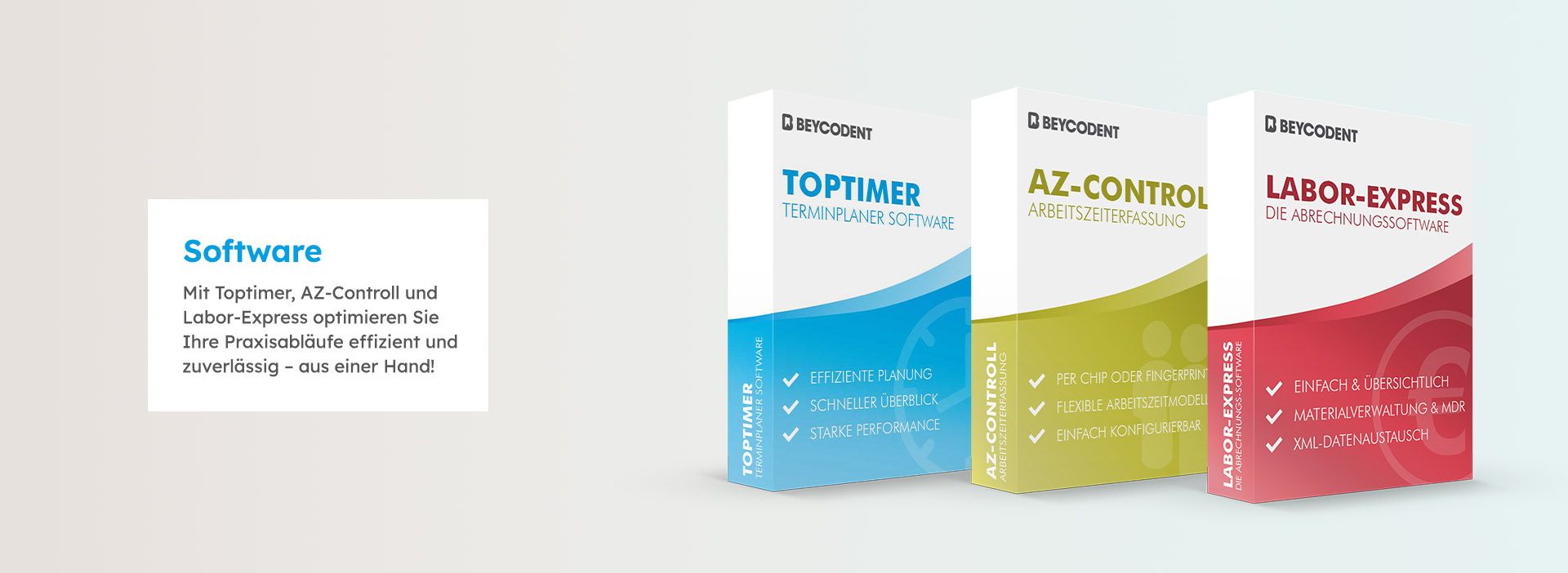 Toptimer als Terminplaner für Zahnarztpraxen und Labore. Die Arbeitszeiterfassung AZ-CONTROLL für das eigene Mitarbeiterteam. LABOR EXPRESS: die Abrechnungssoftware für Dentallabore. Einfachste Installation und hohe Benutzerfreundlichkeit kennzeichnen die EDV-Lösungen von BEYCODENT. Die unabhängigen Komplettlösungen bieten beste Schnittstellenmöglichkeiten für Datenübernahmen und sind für ein optimales Einbeziehen der vorhandenen technischen Struktur ausgelegt.